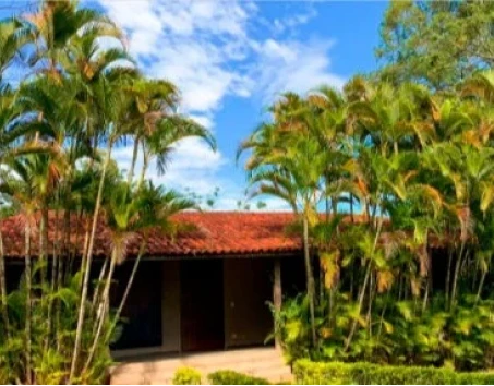 Espaço em meio à vegetação rasteira, com arborização sul americana das nossas belas florestas, entre bromélias e demais flores tropicais.
